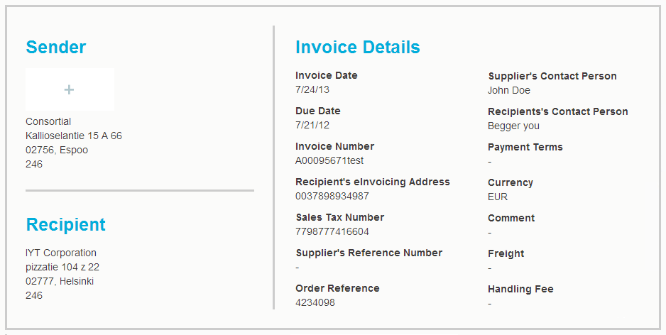 - Business Document Details: For example, the business document number, creation and due dates of the business document and contact persons of the document's sender and the recipient.